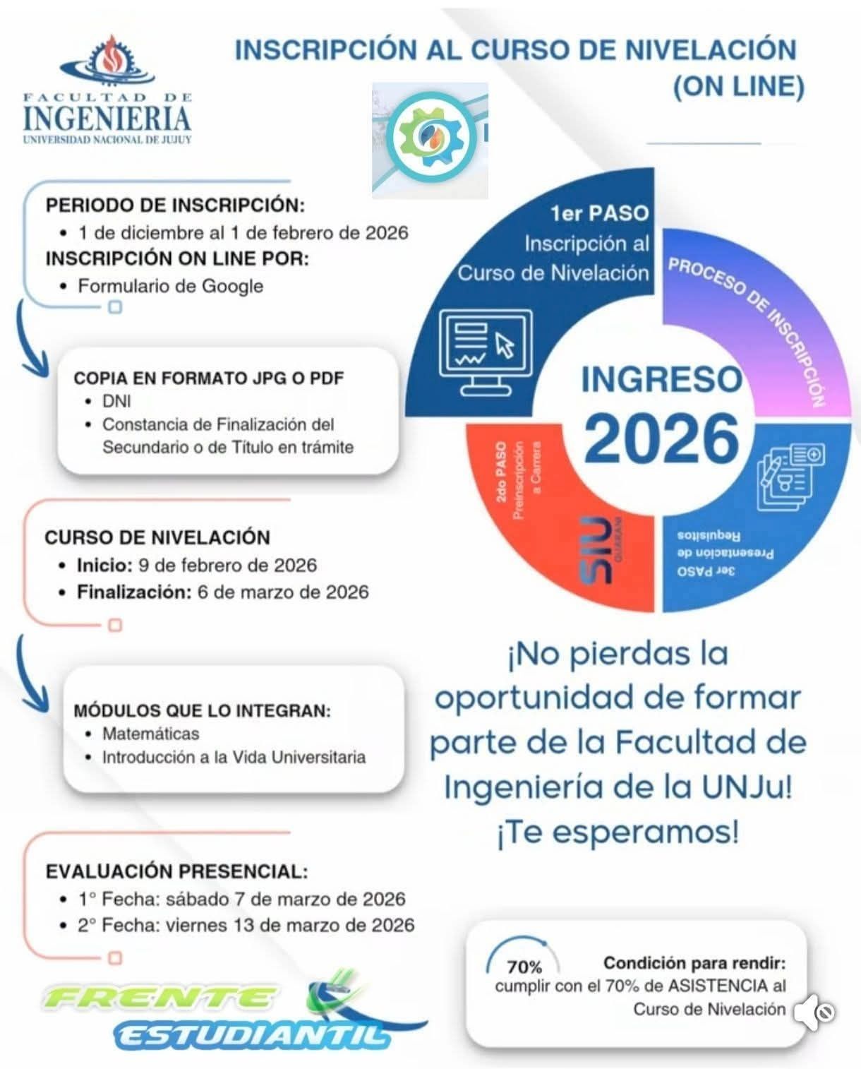 La Facultad de Ingeniería de la UNJu informa que se encuentra abierta la inscripción al Curso de Nivelación, correspondiente al Proceso de Ingreso 2026.